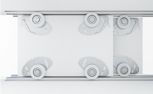 - większe możliwości regulacji; wzmocniony system zapinanych rolek zastosowany jest na dole w szynie jak i do góry w rynnie; idealnie płynne ruchy drzwi;