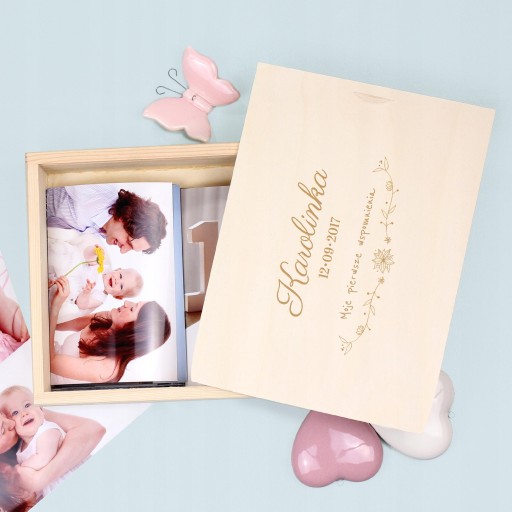 Pierwszy rok w życiu każdego człowieka jest niezmiernie ważny. Pierwsze ząbki, pierwsze kroki i pierwsze słowa – tyle nowości! Wszystkie te momenty zasługują na uwiecznienie, więc pierwszy rok to również setki zdjęć. Pojemne personalizowane pudełko z drewna sosnowego to idealny pomysł na przechowywanie tych wspomnień. Podaruj je młodym rodzicom, a żadna ważna chwila im nie umknie.