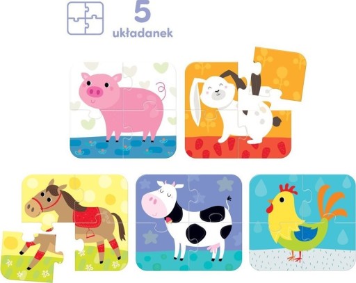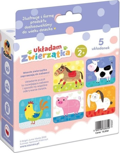 Bright Junior Media Justyna Han Ułóżcie wspólnie puzzle i poznajcie mieszkańców gospodarstwa. Możecie też razem poznawać odgłosy zwierzątek i wymyślać ciekawe historie z wiejskiej zagrody.Proste układanki z dużymi, łatwymi do połączenia elementami na pewno polubią maluchy zaczynające swoją przygodę z puzzlami. Układanie jest świetnym treningiem spostrzegawczości i koordynacji ręka-oko. Małe, podróżne opakowanie sprawia, że puzzle zawsze można mieć przy sobie. Zestaw zawiera 20 elementów (5 układanek)
