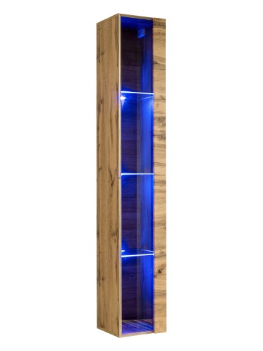 Witryna pionowa : 1 para drzwi częściowo przeszklonych: za nimi 3 półki szklane podświetlone niebieskim światłem LED (4 przestrzenie).Korpusy z obrzeżem ABS, fronty PVC otwierane na push-click. Uniwersalny montaż drzwi.