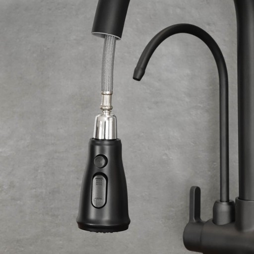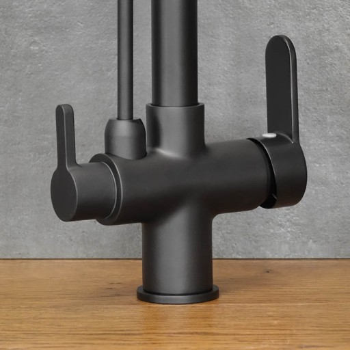 Jeśli poszukujesz baterii, która jest funkcjonalna, a zarazem wpisuje się w stylistykę nowoczesnej kuchni, to wybór baterii Double będzie strzałem w dziesiątkę. Bateria dzięki matowej czerni doskonale wpiszę się w aranżację nowoczesne, loft czy industrial. Oferowany kran jest bardzo funkcjonalny dzięki wyposażeniu w dodatkowy kranik na wodę filtrowaną, wystarczy podpiąć pod niego filtr, aby cieszyć się czystą wodą pitną. Dodatkowym atutem baterii jest wyjmowana wylewka z regulowanym strumieniem wody, dzięki zgrabnemu przyciskowi. Całości dopełniają subtelne uchwyty do regulacji strumienia wody.