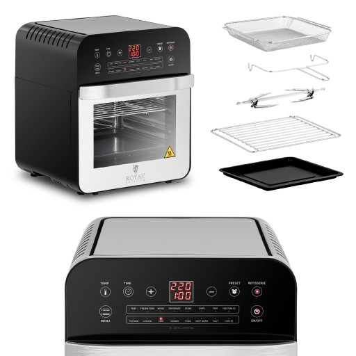 Piekarnik wielofunkcyjny marki Royal Catering to sprzęt zarówno dla gospodarstw domowych, jak i małych restauracji, barów szybkiej obsługi, bistro, stacji benzynowych itp. Piecyk o pojemności 12 l świetnie nadaje się do skrzydełek, zapiekanek, frytek i innych przekąsek. Wydajny piekarnik o dużej mocy 1600 W optymalnie wykorzystuje energię dzięki wentylatorowi oraz górnej grzałce. Łatwa obsługa to efekt wyposażenia w czytelny cyfrowy panel. Wyświetlacz LED pozwala na precyzyjne ustawienie parametrów. Timer działa w zakresie 0-60 minut, natomiast temperaturę ustawia się od 50 do 220C. Piekarnik posiada 13 programów: do frytek, skrzydełek, steków, chipsów, ryb, warzyw, popcornu, kurczaka, ciasta, szaszłyków, pizzy, tostów i ciasteczek. Umożliwia także rozmrażanie, suszenie i utrzymywanie w cieple.