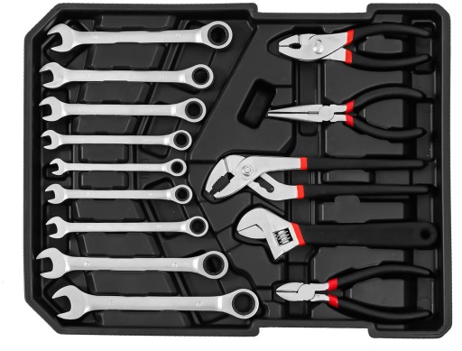 - - 9 kluczy płasko-oczkowych z grzechotką: 8 mm, 9 mm, 10 mm, 11 mm, 12 mm, 13 mm, 14 mm, 15 mm, 17 mm