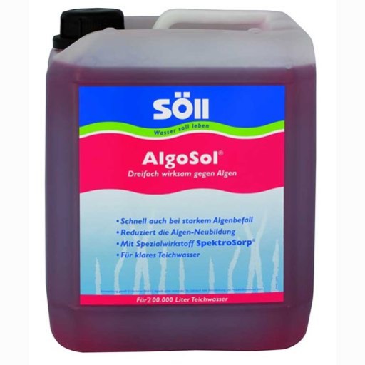 AlgoSol jest płynnym produktem biocide'owym, który został stworzony w celu zmniejszenia ilości glonów i zmiany środowiska korzystnego dla ich rozwoju w stawach dekoracyjnych i biotopach. AlgoSol jest bardzo skuteczny zarówno w walce z glonami zawiesinowymi i jednokomórkowymi glonami zielonymi (tzw. zielona woda) jak również