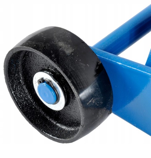 Masywny podnośnik samochodowy, wyposażony w koła jezdne, dzięki czemu łatwo przemieszcza się go w dowolne miejsce pod pojazdem.
