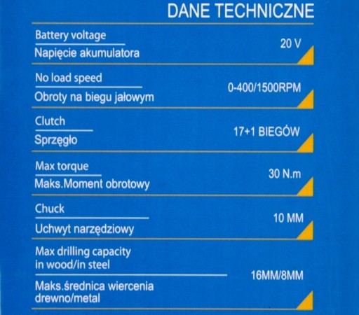 - Napięcie akumulatora: 20V