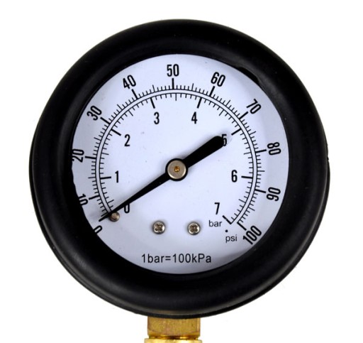 - Metalowy manometr o śr. 75mm zabezpieczony gumową osłoną ze skalą pomiaru 0-7 bar (0-100 PSI)