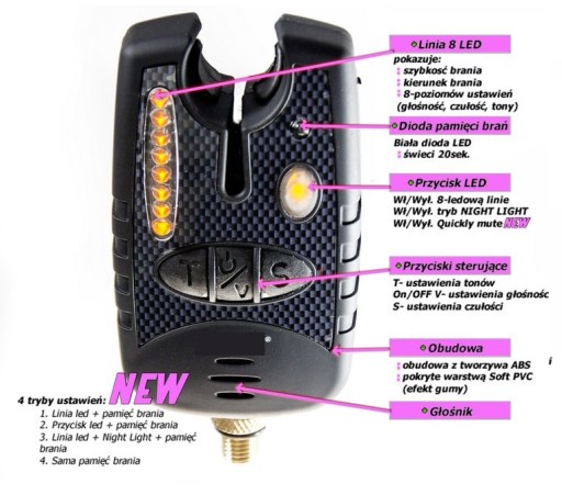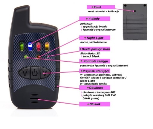 - 4 diody sygnalizująca branie, każda w innym kolorze przypisana do konkretnego sygnalizatora