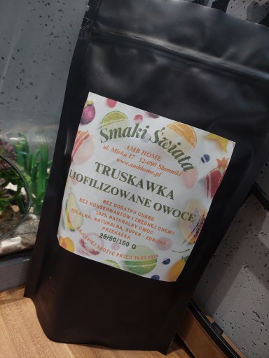 - 20g, 50g, 100g Truskawek Liofilizowanych zapakowanych w czarny doypack