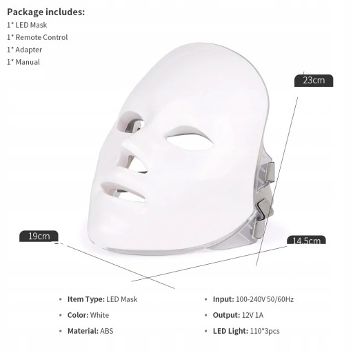 Typ artykułu: maska LED,Kolor: biały Materiał: ABS,Wejście: 100-240V 50/60HzWyjście: 12V 1A LED światła:256 Waga: 260gWymiary: 19*14.5*23cm,