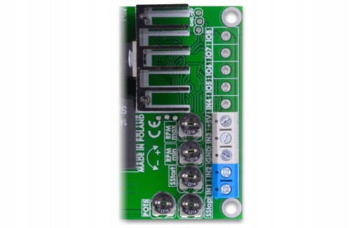 - regulacja obrotów minimalnych (od -50% do 50%) - typowy silnik rozpoczyna prace od 5-15% mocy, układ pozwala ustawić wartość mocy minimalnej indywidualnie dla każdego silnika, wartość ujemna oznacza że możemy ustawić aby podłączony silnik startował dopiero po przekroczeniu nastawionej wartości minimalnej (np. przy napięciu sterującym 0-5V, ustawiając -10%, silnik rozpocznie pracę przy 0,5V)