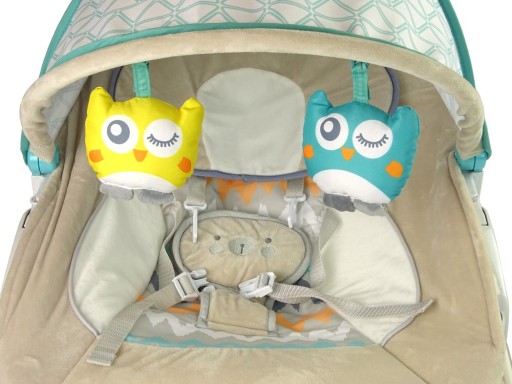 Leżaczek posiada regulacje zmiany pozycji. Cały bujaczek jest wyłożony przyjemnym, pluszowym w dotyku materiałem. Za ochronę przed słońcem, bądź aby zmienić kąt nachylenia zawieszek na górze odpowiada zamontowany daszek. Miękkie podparcie głowy polepsza komfort snu maluszka. Zawieszki pluszowe w kształcie ptaszków z pewnością przyciągną uwagę dziecka, zachęcając do treningu rączek.
