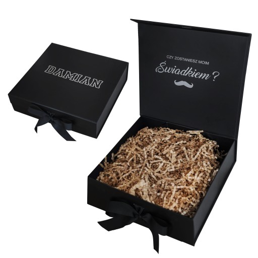 Ekskluzywne pudełko w kształcie kwadratu w kolorze czarnym ze wstążką (szerokość wstążki 4 cm) z imieniem na zewnątrz i napisem Czy zostaniesz moim Świadkiem? wewnątrz.
