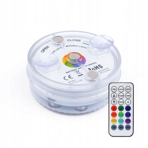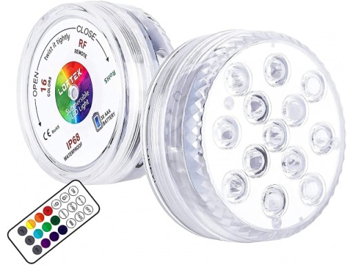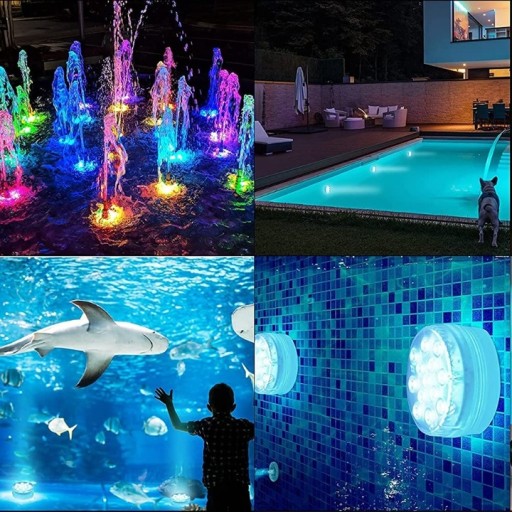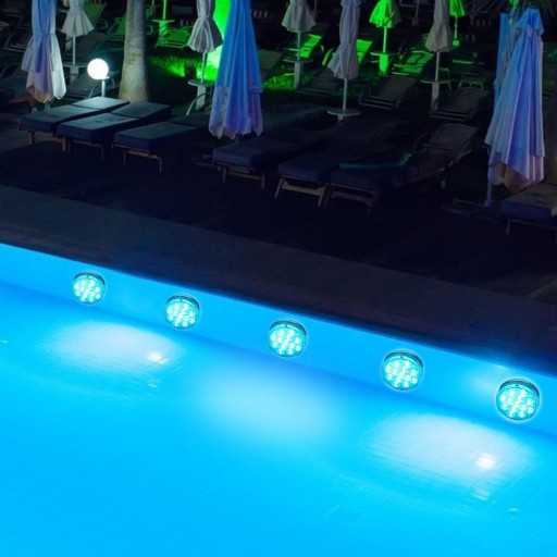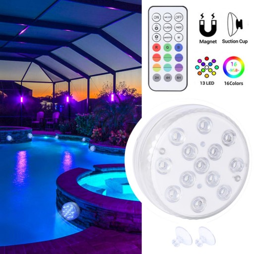 Oświetlenie basenowe - 16 kolorowe lampki, które doskonale doświetlą basen, fontanne lub akwarium. Lampki posiadają 13 mocnych, wysokiej jakości diod LED sterowanych za pomocą pilota.