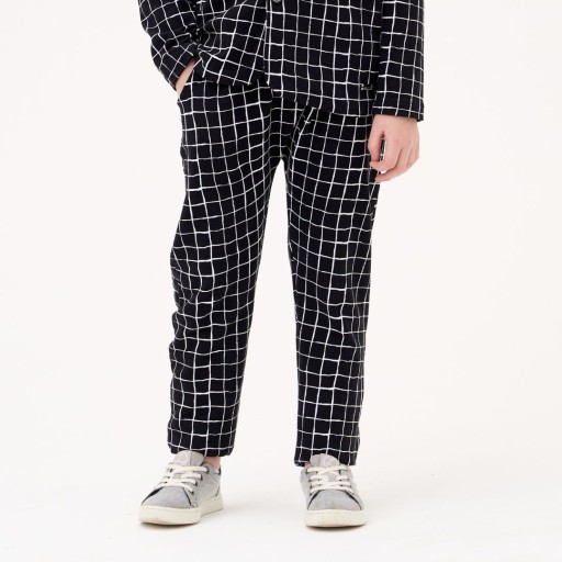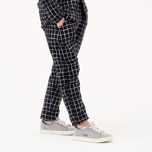 Te czarne spodnie w kratę dla dziecka wykonane z bawełny i elastanu to idealna propozycja dla małych modnych dżentelmenów. Do spodni można dobrać zwykłą bluzkę, koszulę lub naszą przepiękną koszulkę z muchą w kolorze spodni.