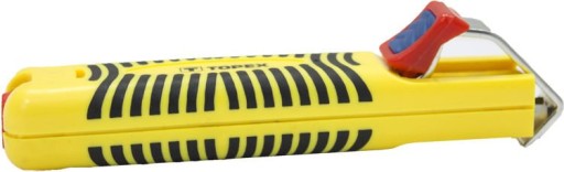 Ściągacz izolacji kabli i przewodów TOPEX (nr ref. 32D810) przeznaczony do prac z przewodami o przekroju kolistym. Posiada precyzyjnie regulowane ostrze oraz śrubę umożliwiającą dostosowanie głębokości cięcia.