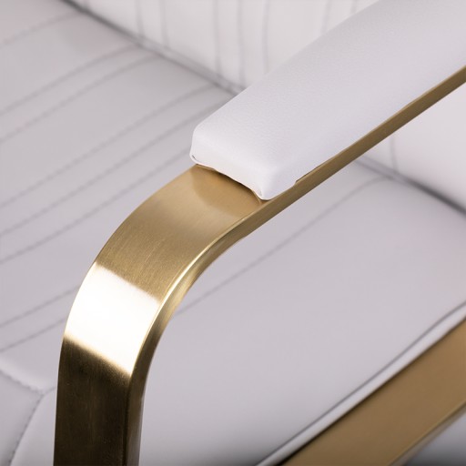 Stylowy fotel fryzjerski. Bardzo komfortowy, idealnie pasujący do wnętrz eleganckich salonów. Regulowany w płaszczyźnie pionowej. Bardzo stabilny i solidny. Obicie z najwyższej jakości ekoskóry koloru beżowego. Dopełnieniem elegancji tego fotela jest złote wykończenie elementów metalowych.