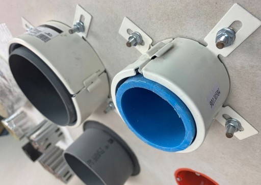 Stalowa osłona zawiera materiał pęczniejący na bazie grafitu, który reaguje na wysoką temperaturę i wypełnia otwór powstały w skutek topienia się plastikowych instalacji (rur) w przepustach.