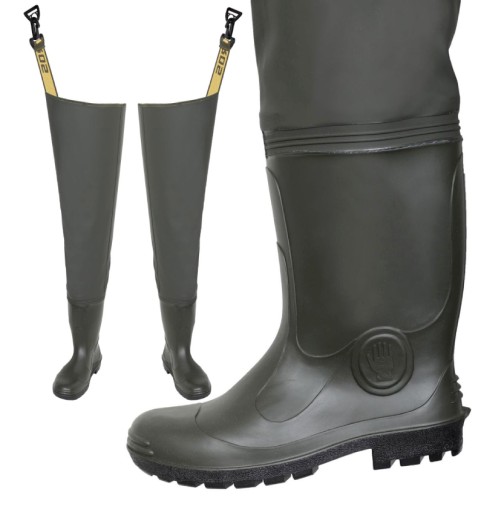 REWELACYJNE, WYTRZYMAŁE I W 100% WODOSZCZELNE, DO BRODZENIA W WODZIE. Wysokie buty rybackie z wgrzanymi na stałe kaloszami. Model do bioder z gumowymi mocowaniami podtrzymującymi. Wygodne mocowanie do paska spodni. Fason woderów daje możliwość szybkiego ich zakładania i zdejmowania.