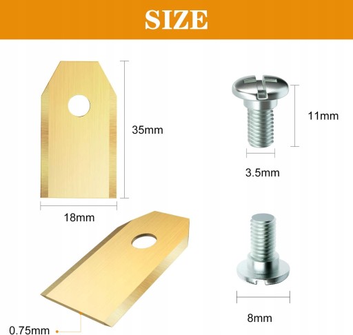 Wysokiej jakoci materiay wyprodukowany z wysokiej jakoci stali nierdzewnej doskonaa odporno na korozj kwasy i alkalia bez problemów z rdz dobrze funkcjonuje w deszczowe dni. atwe do wymiany dwustronne ostrza ze rubami s atwe w montau i demontau. Za pomoc zwykego rubokrta mona go bardzo atwo wymieni. Najwysza wydajno cicia ostrza umoliwiaj efektywne skracanie trawnika. Robot koszcy moe wytrzyma okoo 200250 godzin czasu koszenia. Dziki perfekcyjnemu ciciu trawnik pozostaje nieskazitelny i utrzymuje trawnik w czystoci zielony i zdrowy. Szerokie zastosowanie nadaje si do wszystkich modeli kosiarek Husqvarna Automower Gardena Yard Force. Dokadne dopasowanie ostrzy i rub pasuje do oryginau Opakowanie zawiera 30 ostrzy wymiennych do robota koszcego 30 sztuk rub do robota koszcego. Grubo ok. 075 mm. Waga 3 g. Super lekki i cienki ale wytrzymay.