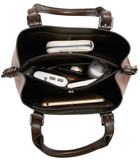 Torebkę składa się z trzech komór, zewnętrzne zapinają się na zatrzaski, a środkowa na zamek.