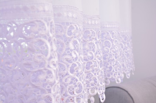 Oferujemy państwu firanę z białego woalu wykończoną gipiurą oraz lamówką, gotową do zawieszenia.