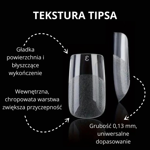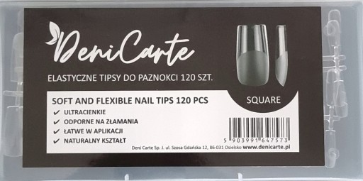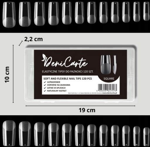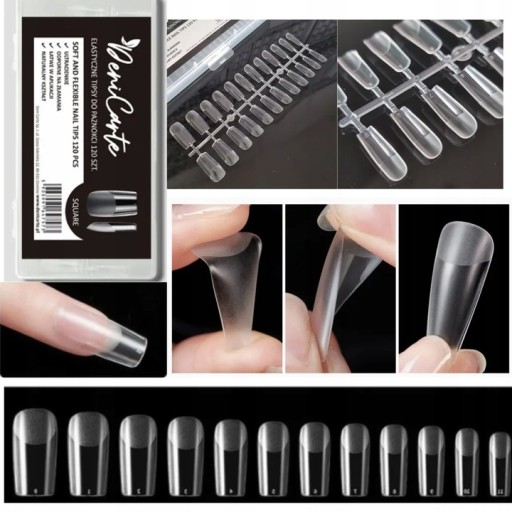 - ✅Tipsy wykonane są z wysokiej jakości plastiku. Wyjątkowo miękkie i elastycznie, nie odkształcają się po zgięciu, dzięki temu idealnie dopasowują się do naturalnego kształtu paznokcia. ✅Kieszonka tipsa jest specjalnie przygotowana - już matowa dzięki której wiemy do którego miejsca aplikować produkt na płytkę - ułatwia to i skraca czas przedłużania. W metodzie przedłużenia mogą zastąpić szablony. ✅Szczegóły: ✔️uniwersalne kształty, które pozwalają dopasować formę do różnych płytek paznokcia – szerokich, drobnych, rosnących w górę bądź w dół. ✔️łatwe uzupełnienie paznokcia poprzez nadbudowanie w miejscu wystąpienia odrostu ✔️trwałość porównywalna do żelu ✔️są przezroczyste, więc idealne do każdego rodzaju stylizacji. ✔️120 sztuk w opakowaniu ✔️zmatowiona kieszonka ułatwiająca aplikację produktu, nie wymaga matowienia tipsa przed aplikacją ✔️proste krawędzie ✔️ponumerowane rozmiary od 0 do 9 ✔️cienkie ✔️Zapakowane w wygodne pudełeczko. ✔️bardzo modny kształt square ✅Opakowanie zawiera 120 sztuk tipsów w rożnych rozmiarach. Każdy dopasuje tipsy do kształtu i rozmiaru naturalnych paznokci. ✅Tipsy po przyklejeniu klejem do tipsów należy dobudować akrylem lub żelem. Można pomalować każdym lakierem lub ozdobić dowolną metodą. Mogą być stosowane pod lampą w celu utwardzenia nałożonego produktu.