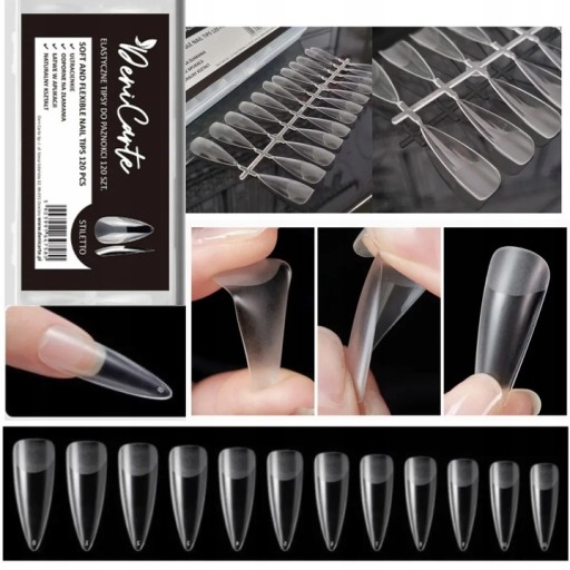 - ✅Tipsy wykonane są z wysokiej jakości plastiku. Wyjątkowo miękkie i elastycznie, nie odkształcają się po zgięciu, dzięki temu idealnie dopasowują się do naturalnego kształtu paznokcia. ✅Kieszonka tipsa jest specjalnie przygotowana - już matowa dzięki której wiemy do którego miejsca aplikować produkt na płytkę - ułatwia to i skraca czas przedłużania. W metodzie przedłużenia mogą zastąpić szablony. ✅Szczegóły: ✔️uniwersalne kształty, które pozwalają dopasować formę do różnych płytek paznokcia – szerokich, drobnych, rosnących w górę bądź w dół. ✔️łatwe uzupełnienie paznokcia poprzez nadbudowanie w miejscu wystąpienia odrostu ✔️trwałość porównywalna do żelu ✔️są przezroczyste, więc idealne do każdego rodzaju stylizacji. ✔️120 sztuk w opakowaniu ✔️zmatowiona kieszonka ułatwiająca aplikację produktu, nie wymaga matowienia tipsa przed aplikacją ✔️proste krawędzie ✔️ponumerowane rozmiary od 0 do 9 ✔️cienkie ✔️Zapakowane w wygodne pudełeczko. ✔️bardzo modny kształt stiletto ✅Opakowanie zawiera 120 sztuk tipsów w rożnych rozmiarach. Każdy dopasuje tipsy do kształtu i rozmiaru naturalnych paznokci. ✅Tipsy po przyklejeniu klejem do tipsów należy dobudować akrylem lub żelem. Można pomalować każdym lakierem lub ozdobić dowolną metodą. Mogą być stosowane pod lampą w celu utwardzenia nałożonego produktu.