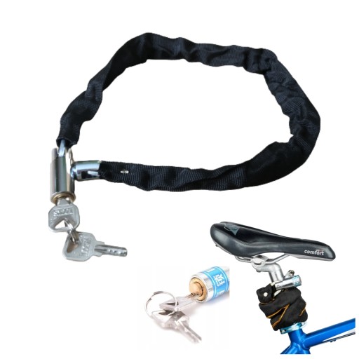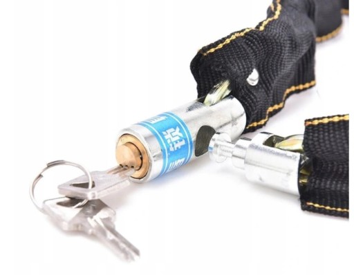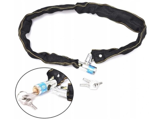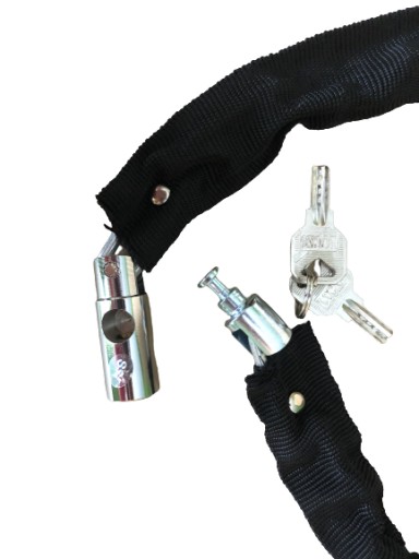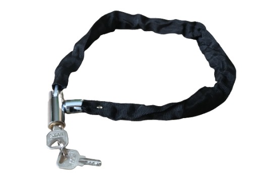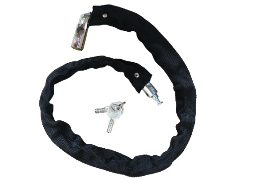 - Dodatkowo, wyposażony jest w solidny zamek (2 klucze w zestawie), a łańcuch posiada ochronny pokrowiec.