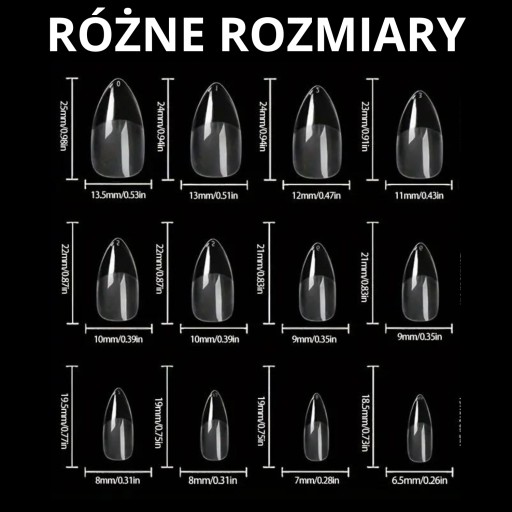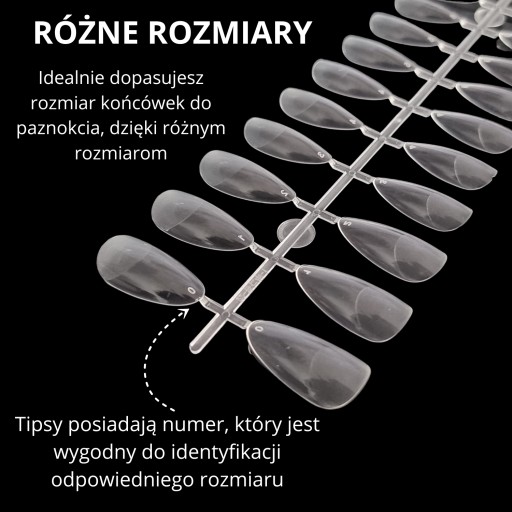 W opakowaniu znajdują się tipsy w rozmiarach od 0 do 9, co umożliwia idealne dopasowanie rozmiaru. Dzięki temu łatwo można dobrać odpowiedni rozmiar do każdego palca, co usprawnia pracę i zapewnia perfekcyjny efekt stylizacji.