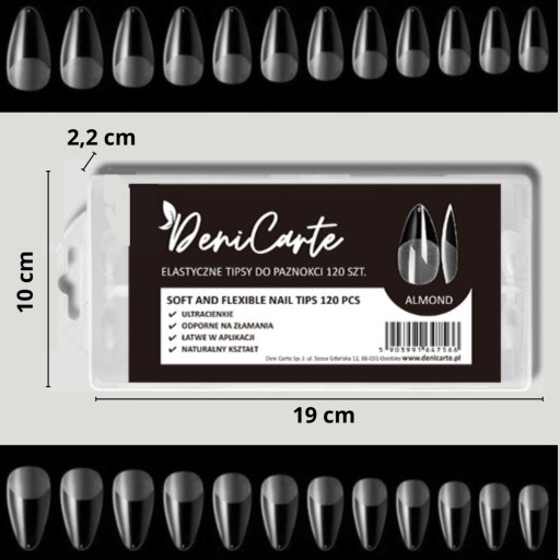 Elastyczne tipsy w kształcie migdałka zostały zaprojektowane z myślą o maksymalnym komforcie noszenia i naturalnym wyglądzie. Dzięki zwiększonej giętkości lepiej dopasowują się do płytki paznokcia, zapewniając długotrwałą stylizację.