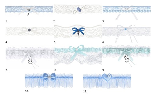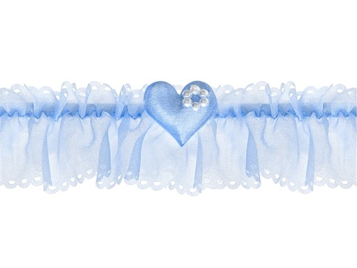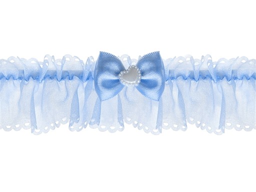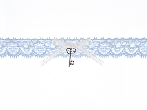 Podwiązka koronkowa w kolorze białym z satynową tasiemką i niebieskim oczkiem, szerokość 3,5 centymetra.