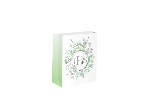 Torebka prezentowa z nadrukiem gałązek eukaliptusa i srebrnej hostii, idealna na prezenty komunijne.