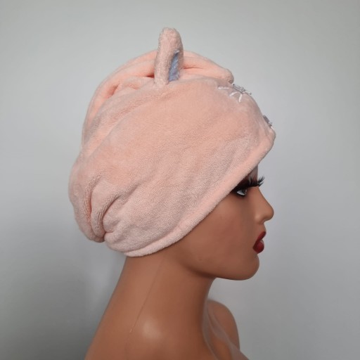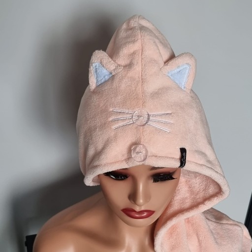 Szybkoschnący ręcznik/czepek z motywem uroczego kotka to idealne rozwiązanie dla każdej kobiety, która dba o swoje włosy i ich odbudowę.