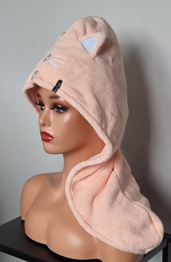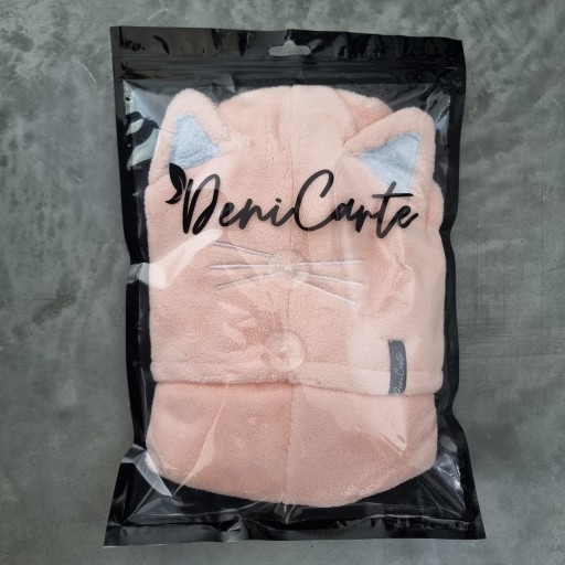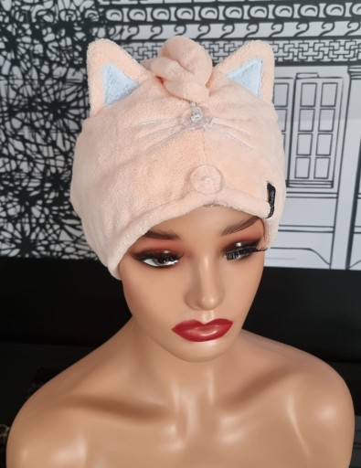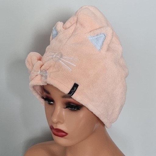Szybkoschnący ręcznik/czepek z motywem uroczego kotka to idealne rozwiązanie dla każdej kobiety, która dba o swoje włosy i ich odbudowę.