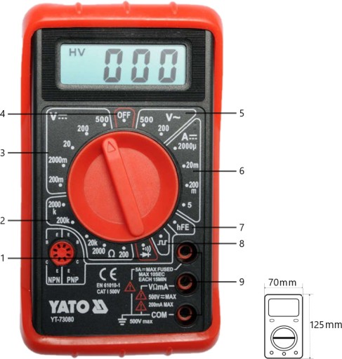 - test tranzystorów hFe: 0-1000, wbudowane gniazdo pomiarowe