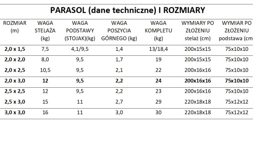 Produkujemy parasole o innych wymiarach podanych w tabeli poniżej (dostępne na innych aukcjach).