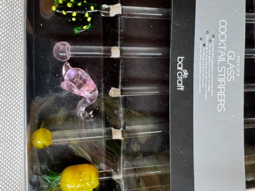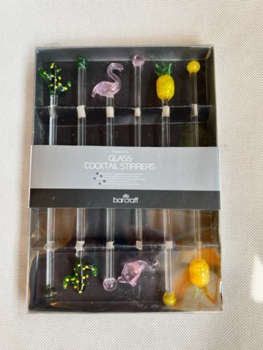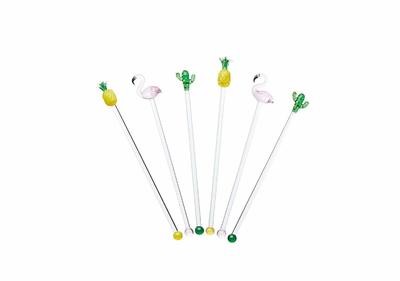 BarCraft Glass Cocktail Stirring Sticks allow drinkers to swizzle cocktails with all zing and pizzazz of a big kid. Each set includes six cocktail swizzle sticks in three bright designs, making them great fun for parties. There's a perky pineapple, a flamboyant flamingo and a vibrant cacti. Together, they're sure to have the room smiling.