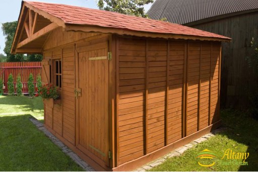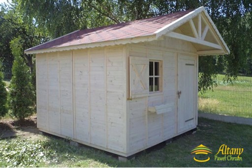 Wymiary 3x3m, dach dwuspadowy, wysunięty z przodu na ok. 80 cm, tworząc nad drzwiami i oknem "mini taras". Całość ścian odeskowana metodą na pióro i wpust . Konstrukcja domku umożliwia Klientowi samodzielne ocieplenie domku od wewnątrz.