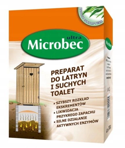 Microbec Ultra to proszek z dodatkiem aktywnych biologicznie enzymów i bakterii, który wspomaga i przyspiesza rozkład organicznych odpadów w latrynach i suchych toaletach. Redukuje zawartość twardych ekskrementów, rozpuszcza organiczne substancje oraz skutecznie eliminuje nieprzyjemny zapach.