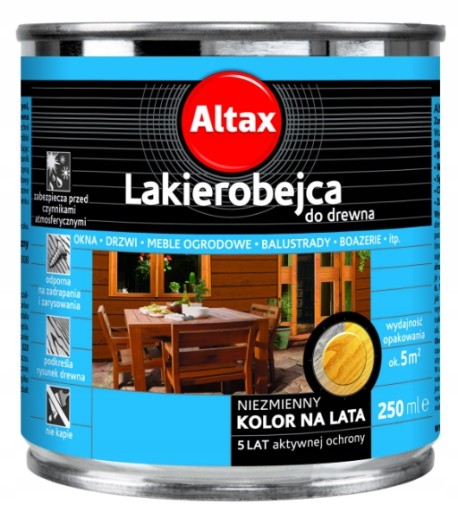 Lakierobejca do drewna Altax pozwoli zabezpieczyć powierzchnię przed szeregiem niekorzystnych czynników zewnętrznych – takich jak niskie temperatury, biokorozja czy też promieniowanie UV. Produkt nadaje się do stosowania zarówno na meblach ogrodowych, jak i do zabezpieczenia balustrad bądź okien. Preparat jest dostępny w odcieniu Venge, który został dodatkowo podkreślony efektownym półpołyskiem.