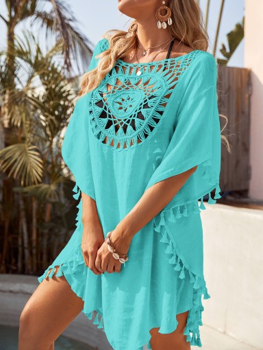 Okrycie plażowe jest dostarczane z dzianinowymi, wydrążonymi, rozcięciami po bokach, dekoltem w szpic i krótkim rękawem, chroniącymi przed bezpośrednim słońcem, najlepszym i niezbędnym na wspaniałe wakacje na plaży