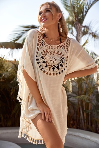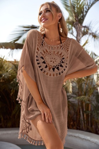 Okrycie plażowe jest dostarczane z dzianinowymi, wydrążonymi, rozcięciami po bokach, dekoltem w szpic i krótkim rękawem, chroniącymi przed bezpośrednim słońcem, najlepszym i niezbędnym na wspaniałe wakacje na plaży