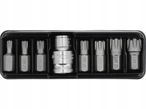 Profesjonalny zestaw bitów, s?u??cy do odkr?cania ?rub specjalnych typu: ribe. Ró?norodno?? bitów zapewnia mo?liwo?? wykonania wielu prac w specjalistycznych serwisach mechanicznych i samochodowych. Ko?cówki posiadaj? d?ugo?? 30 mm, mocowane w uchwycie sze?ciok?tnym 10 mm, dostosowanym do wspó?pracy z grzechotk? 1/2.Zestaw wykonany z najwy?szej jako?ci stali stopowej narz?dziowej S2, która charakteryzuje si?: wysok? twardo?ci? HRC 58-62 jednolit?, drobnoziarnist? struktur? materia?u odporno?ci? na skr?canie wysokim momentem dokr?cania - 21,8 Nm doskona?ym zahartowaniem