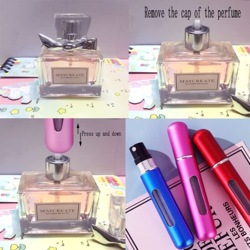 Zdejmij nasadkę atomizera z flakonu Twoich perfum, umieść napełnialny flakon z atomizerem na odsłoniętym końcu rurki atomizera i napełnij go pompując.