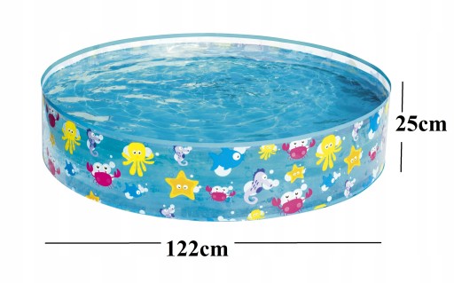 - Basenik jest łatwy w montażu, podczas napełniania wodą rozpręża się do swoich maksymalnych rozmiarów.