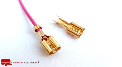 Konektor żeński w kolorze mosiądzu wykorzystywany jest jako zacisk na przewodach wielodrutowych znajdujących się w instalacjach elektrycznych, np. przyczep. Konektory te doskonale sprawdzają się we wszelkich połączeniach w lampach ze stykami na żarówki. Dzięki jego wykorzystaniu zapewnisz przewodom precyzyjne, bezpieczne podłączenie z całą instalacją. Idealnie pasują do tylnych lamp zespolonych, obrysówek, lamp cofania czy przeciwmgłowych, wszędzie tam gdzie występują typowe blaszki stykowe. Produkt wykonano z mosiądzu, co świadczy o jego trwałości i wysokiej odporności na uszkodzenia, dzięki czemu będziesz mógł go długotrwale użytkować.