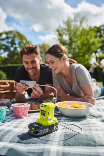 Adapter USB R18USB-0 Ryobi 5133004381 umożliwia ładowanie urządzeń mobilnych. Posiada dwa gniazda USB 2,1A i 1,0A. Adapter jest zasilany akumulatorem litowo-jonowym 18V ONE+, dzięki czemu stanowi praktyczne uzupełnienie elektronarzędzi i innych urządzeń z systemu ONE+. Ładowarka USB przyda się w podróży, na biwaku czy podczas prac w warsztacie. Dzięki niej szybko i wygodnie naładujemy swój telefon czy inne mobilne urządzenie.