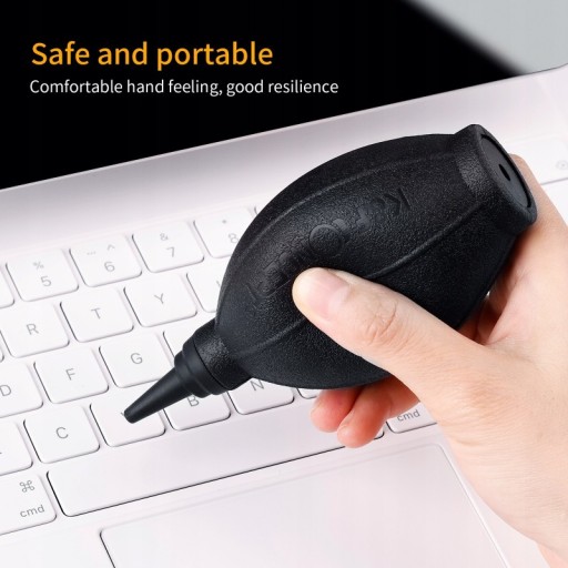 Duża czarna dmuchawa z łatwością usuwa kurz i zanieczyszczenia z matryc aparatów, obiektywów i filtrów za pomocą silnego podmuchu powietrza.