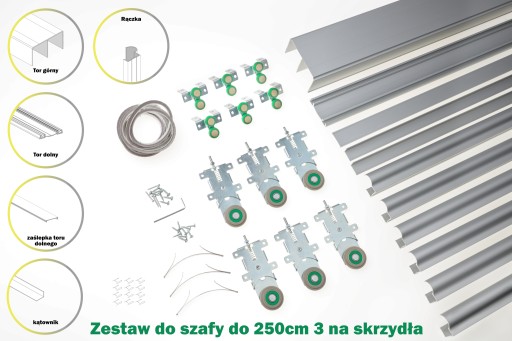Przedmiotem aukcji jest system przesuwny do szafy trzyskrzydłowej szerokości do 250cm w kolorze srebrnym,